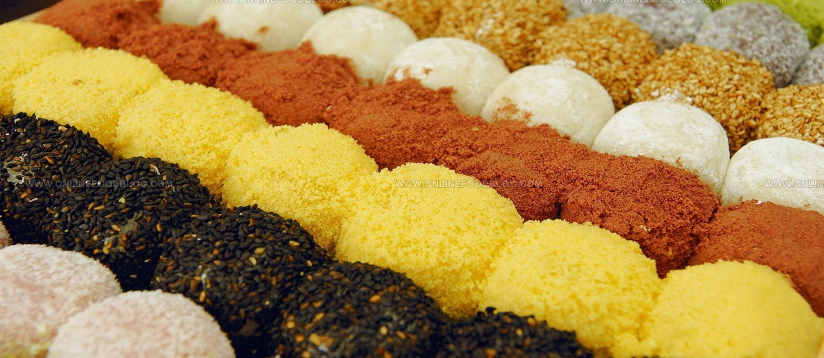 Colorful powders like ground black sesame, toasted soybean, mugwort, and grated coconut coat the exterior, creating visual appeal and added flavor complexity.