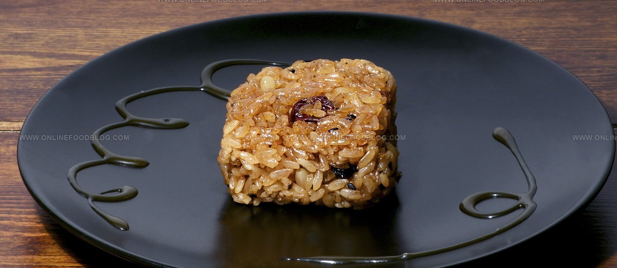 Dark brown caramelized sauce made with soy sauce, cinnamon, and sesame oil coats each grain, creating a complex flavor profile.
