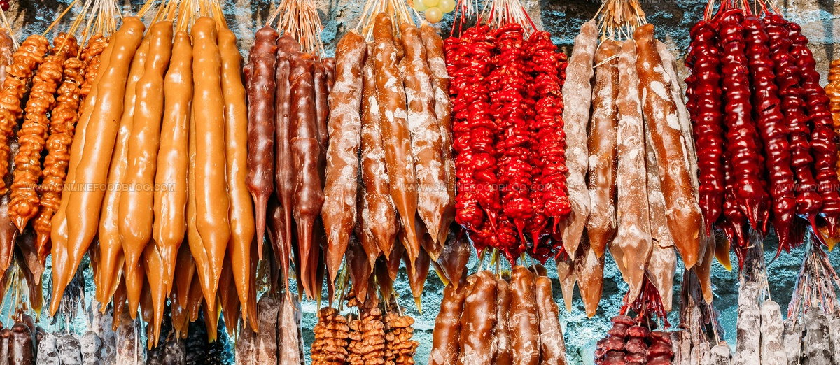 Churchkhela, Georgia's beloved national candy, dangles like a waxy candle packed with nutty goodness and sweet grape essence.