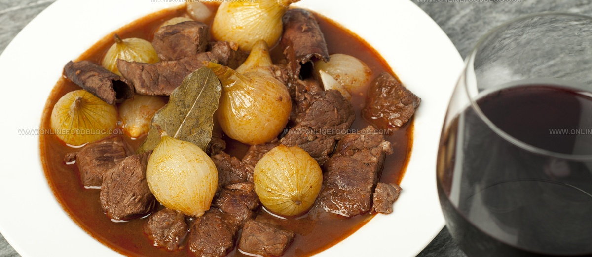 Shoulder or short rib cuts of pork serve as the primary protein, absorbing the deep flavors of dry red wine and crushed coriander seeds.