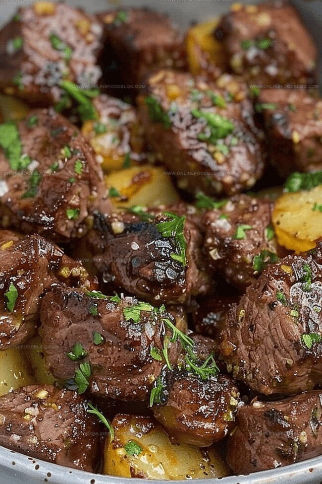 - Transfer crispy potatoes to serving platter, artfully arrange seared steak bites on top, then lavishly drizzle with aromatic garlic butter sauce.