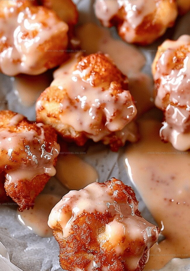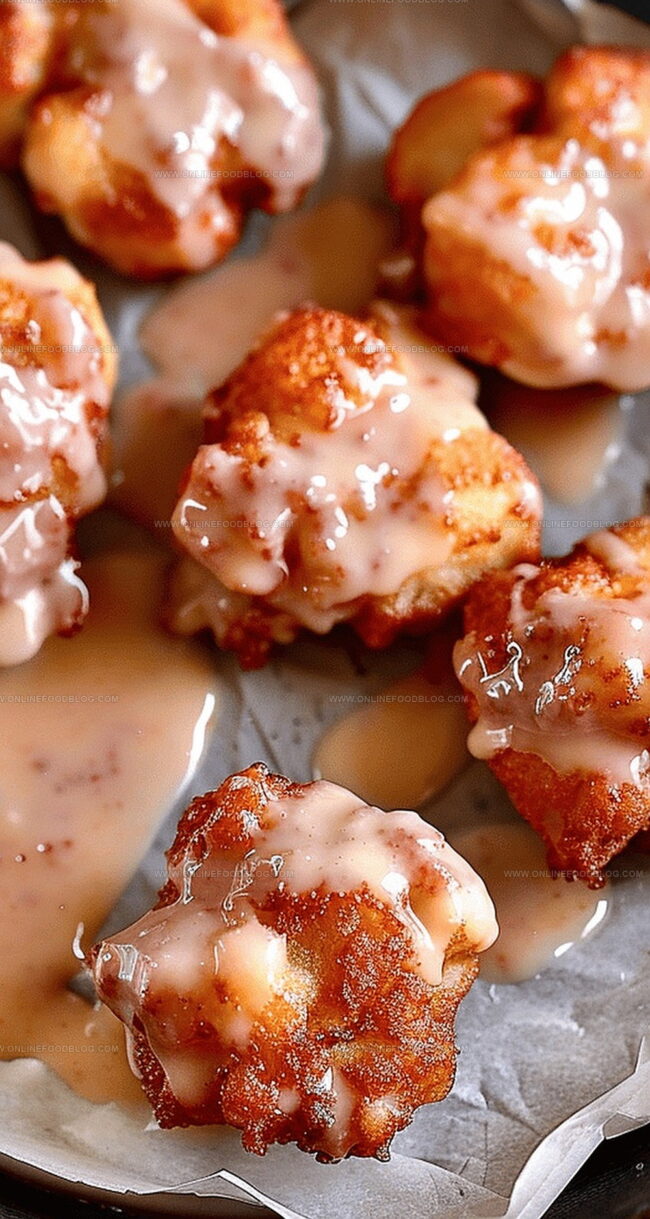 While fritters are still warm, generously drizzle or completely immerse them in the aromatic cinnamon glaze, serving immediately for optimal taste and texture.