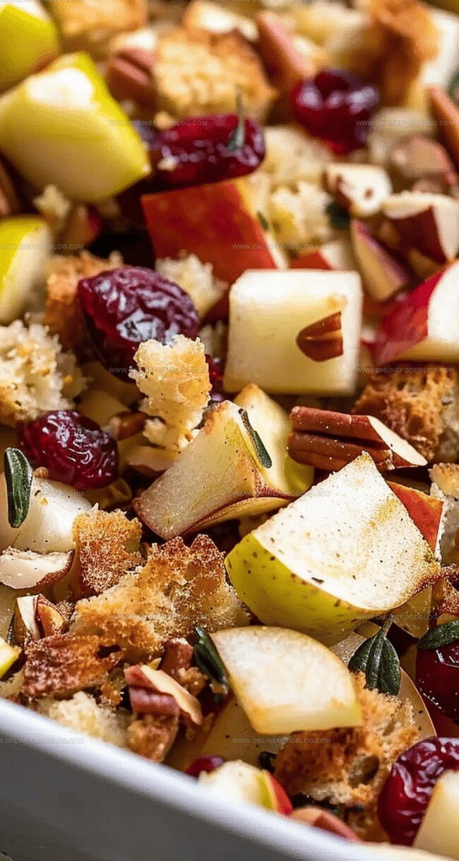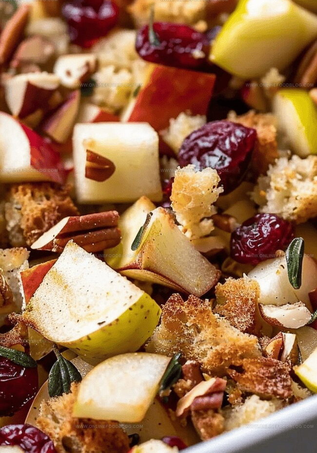 - Assemble the harvest medley by combining the toasted bread cubes, fragrant vegetable mixture, crisp diced apples, and tangy dried cranberries in a spacious mixing bowl.