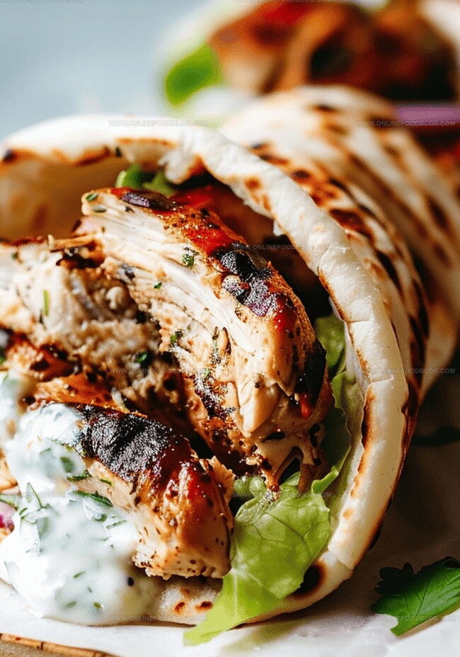- Assemble Gyros: Layer warm bread with tzatziki sauce, grilled chicken slices, crisp lettuce, tomato, and crumbled feta cheese.