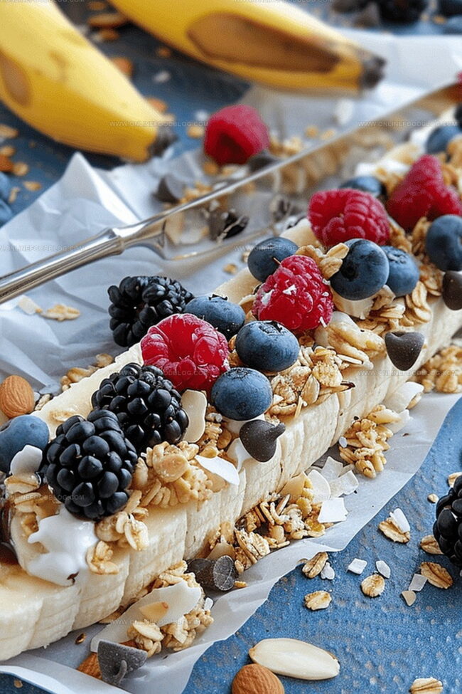 - Scatter a generous mixture of sliced almonds, crunchy granola, and shredded dried coconut across the yogurt-covered banana surfaces.