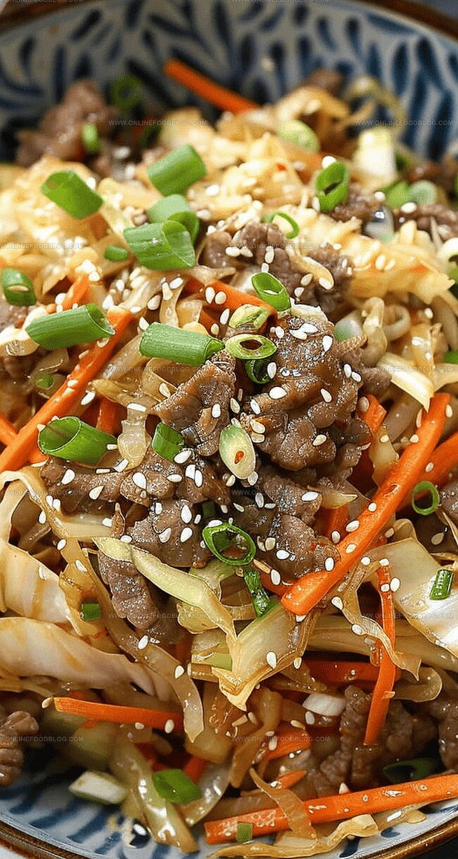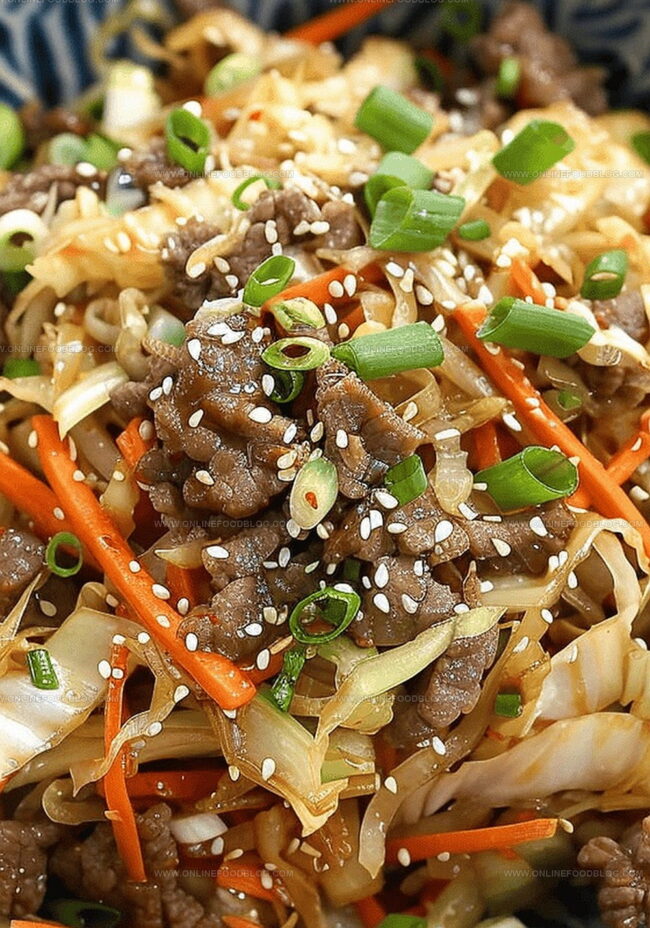 - Gently fold shredded cabbage and carrots into the sizzling beef mixture. Continuously stir and cook for 3-4 minutes until vegetables become slightly tender but retain a slight crunch. Pour the prepared sauce over the skillet and incorporate sliced green onions, ensuring every morsel is evenly coated with the aromatic seasoning.