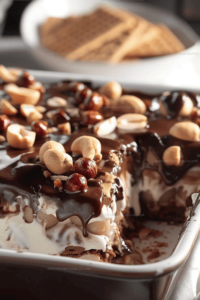 Pour hot fudge sauce evenly across the ice cream layer. Use a spatula to spread the sauce, ensuring complete coverage. Sprinkle the following ingredients over the fudge:Step 4: Add the Final Ice Cream Layer
