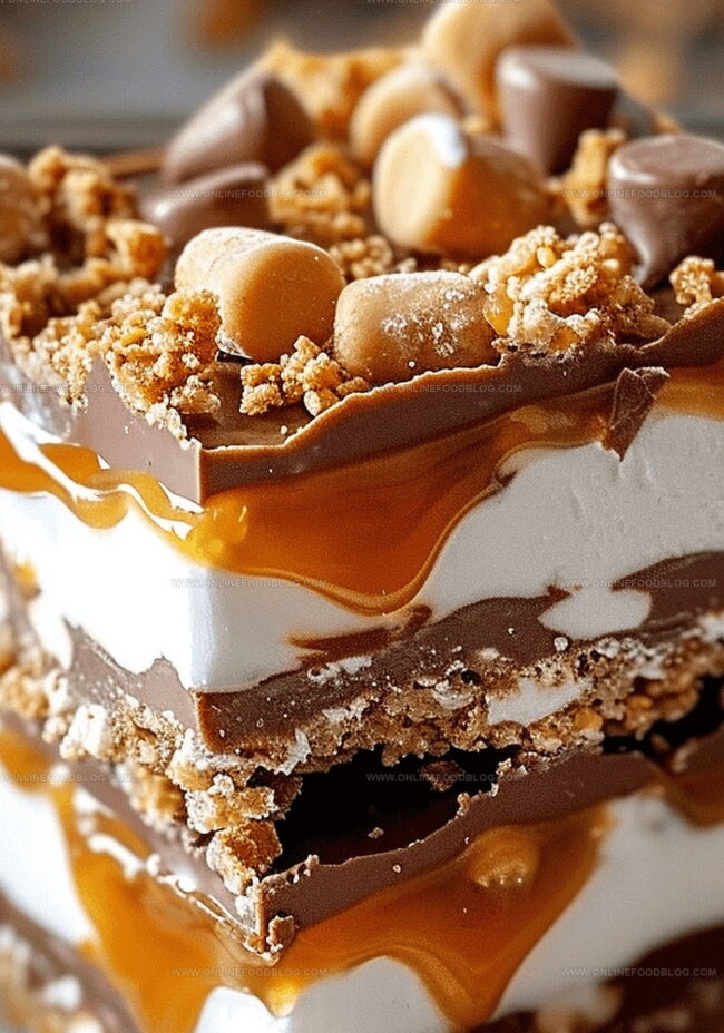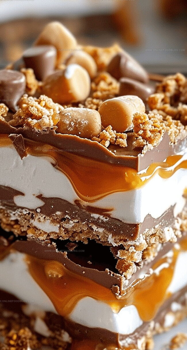 - Graham cracker base provides a crunchy foundation that perfectly complements the gooey caramel and marshmallow layers.