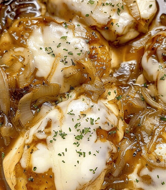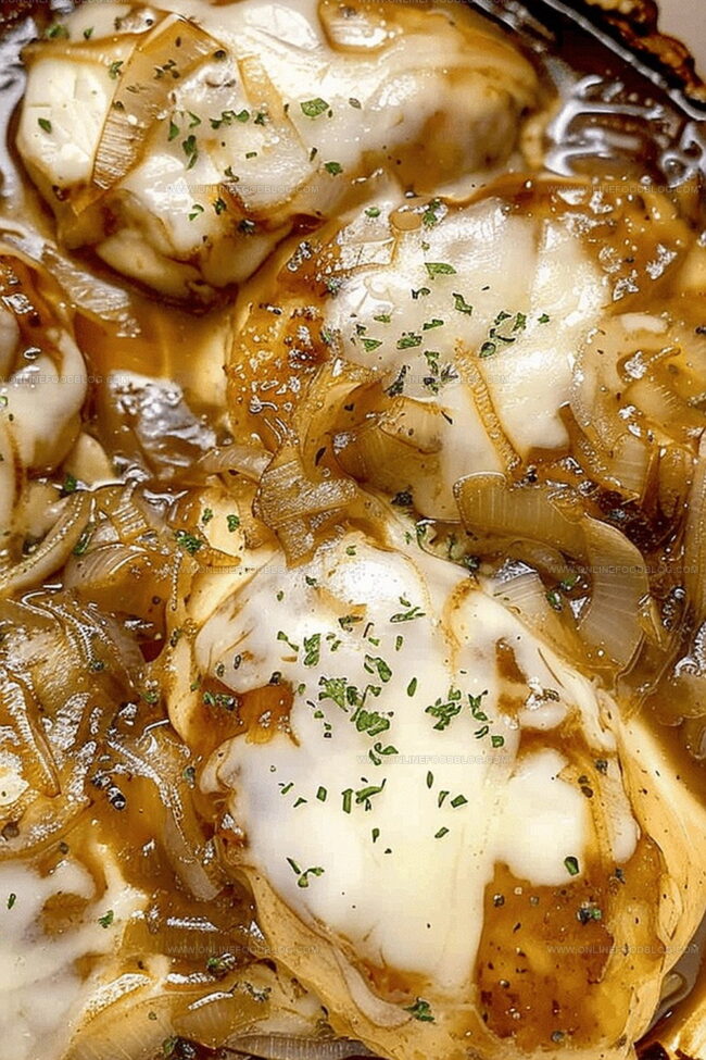 Caramelized onions melt into a golden, bubbling sauce that perfectly complements tender chicken breasts.