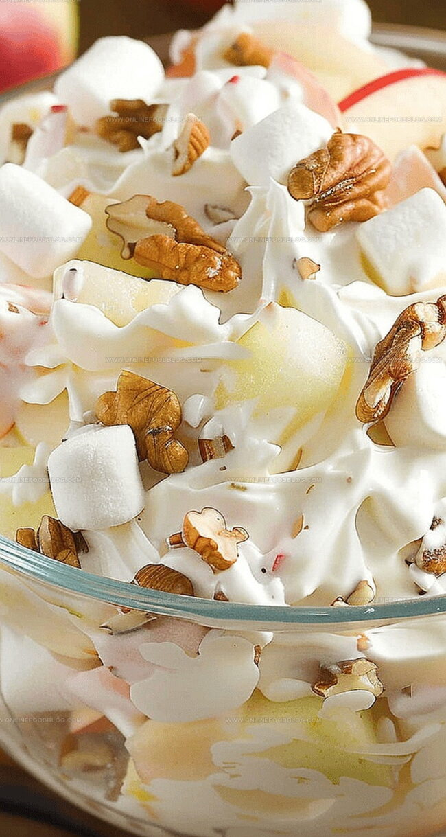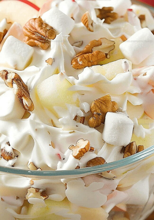 - Incorporate diced apples, chopped nuts, and miniature marshmallows into the cream mixture, stirring with a spatula to guarantee every ingredient is thoroughly coated and harmoniously distributed.
