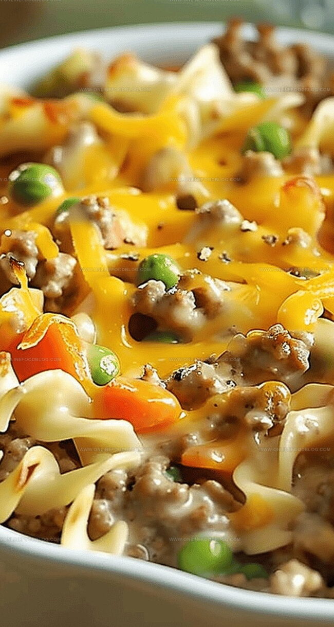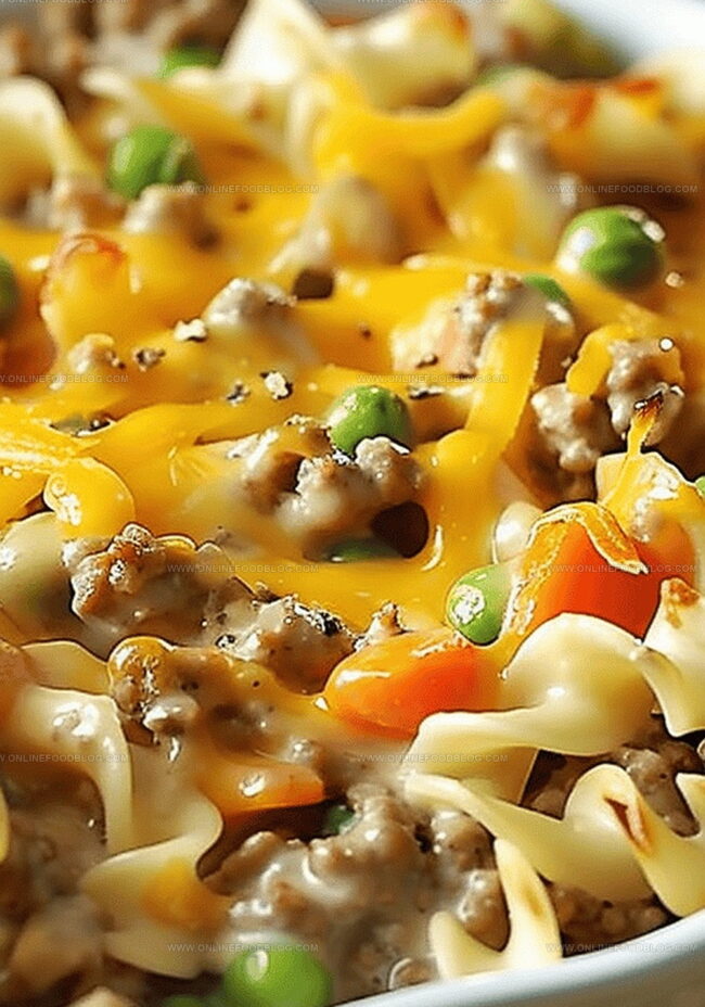 - Combine the seasoned ground beef in a spacious mixing bowl with frozen mixed vegetables, cooked egg noodles, and cream of mushroom soup. Gently fold the ingredients until they are uniformly distributed and the noodles are completely enveloped in the creamy sauce.