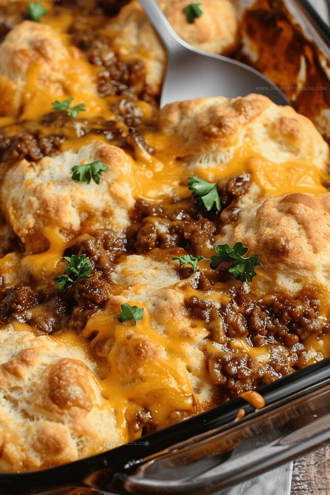 Savory ground beef mingles with soft, buttery biscuits creating a rustic and irresistible combination that feels like a culinary hug.