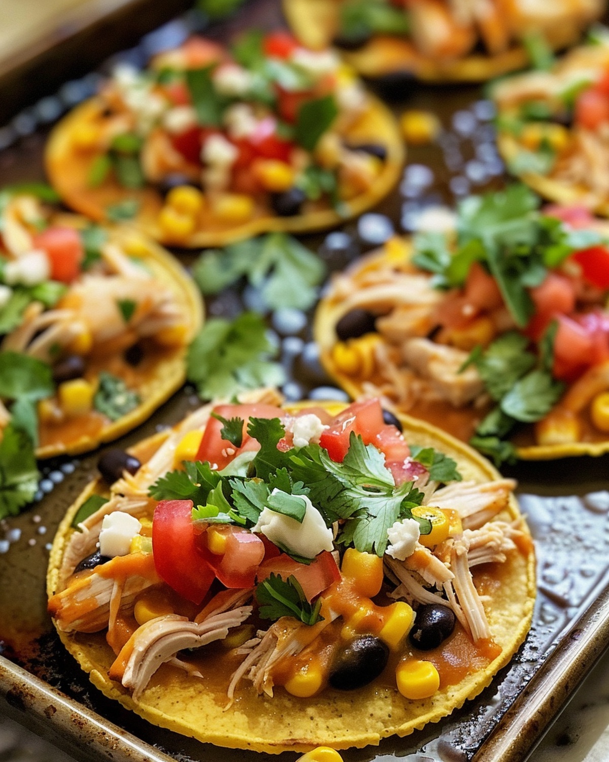 - Once baked, carefully remove the tostadas from the oven and garnish with freshly chopped cilantro and diced tomatoes.
