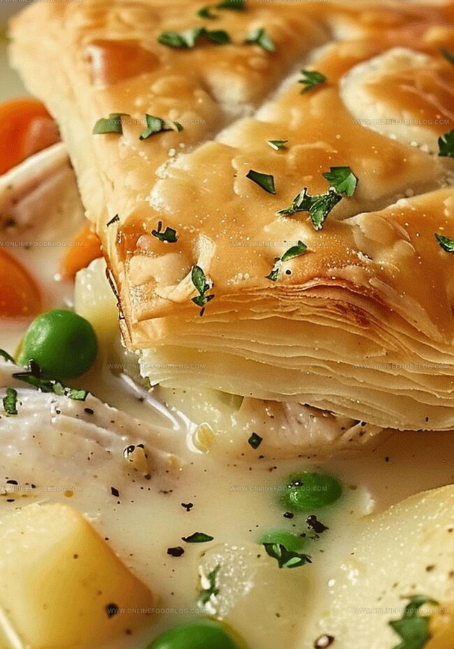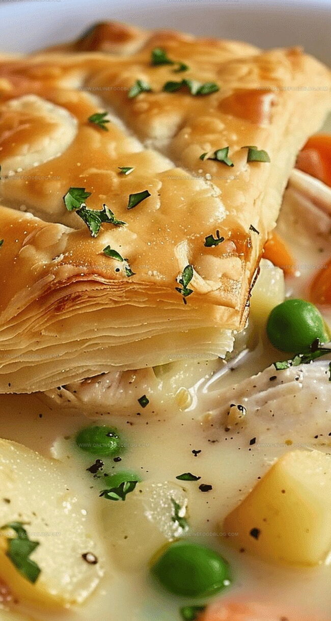 - Serve the pot pie filling in deep bowls, garnishing with delicate puff pastry fragments or freshly chopped parsley for an elegant finishing touch.