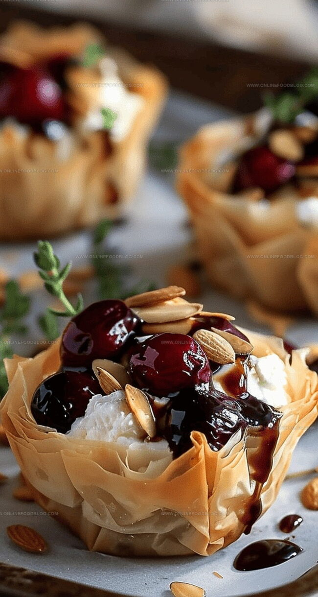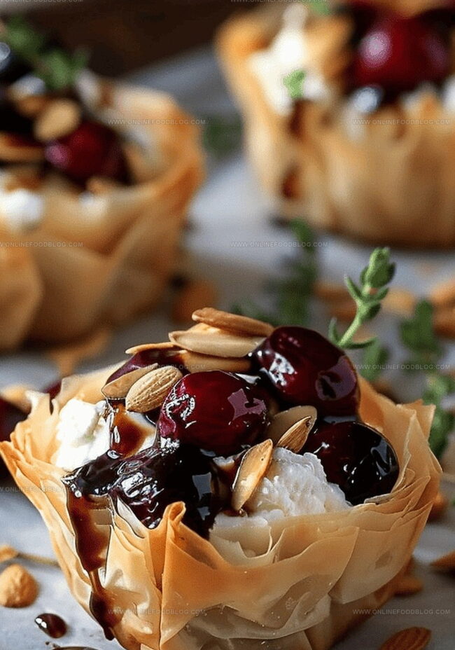 Cranberry & Almond Goat Cheese Phyllo Bites combine elegant flavors from Mediterranean and North American cuisines. Crisp phyllo layers cradle creamy goat cheese, tart cranberries, and toasted almonds, then shimmer with a luxurious maple balsamic reduction that invites savory-sweet exploration.