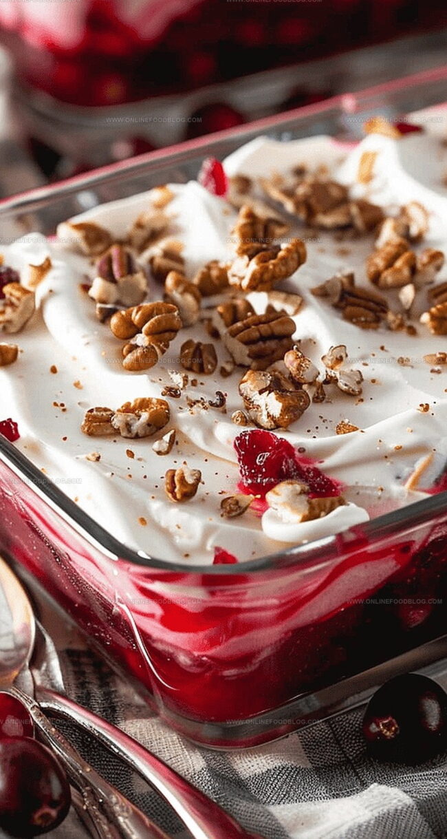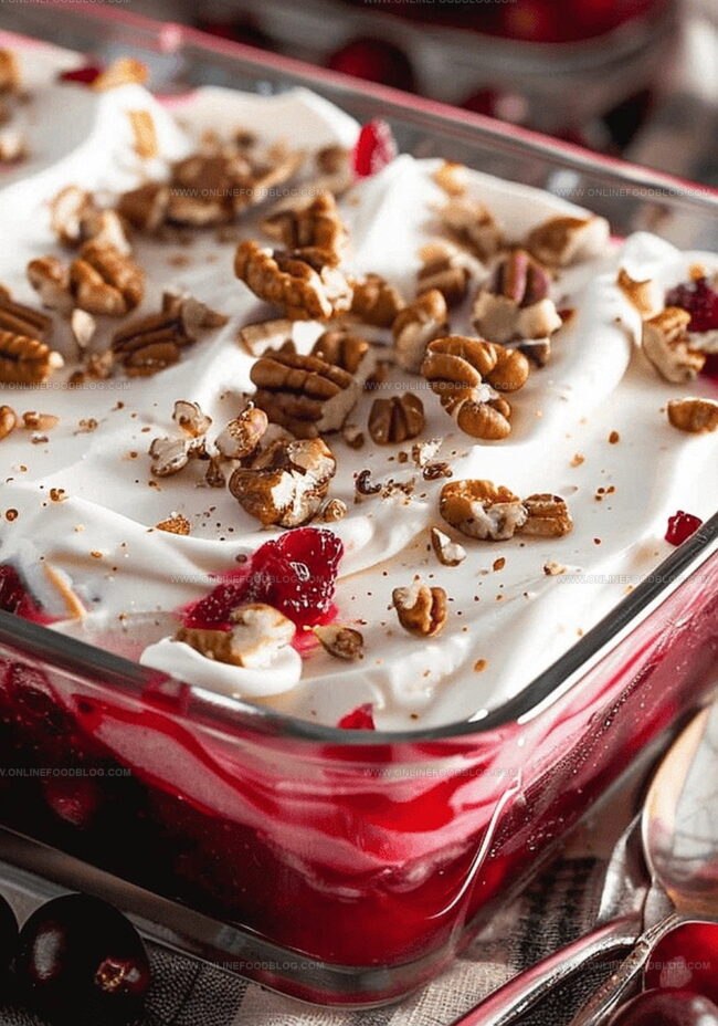 Cranberry Delight Jello Salad offers a festive blend of tart cranberries and smooth cream cheese nestled in a ruby-red gelatin base. Winter holiday tables welcome this delightful dessert that combines classic flavors with elegant presentation for delicious memories.