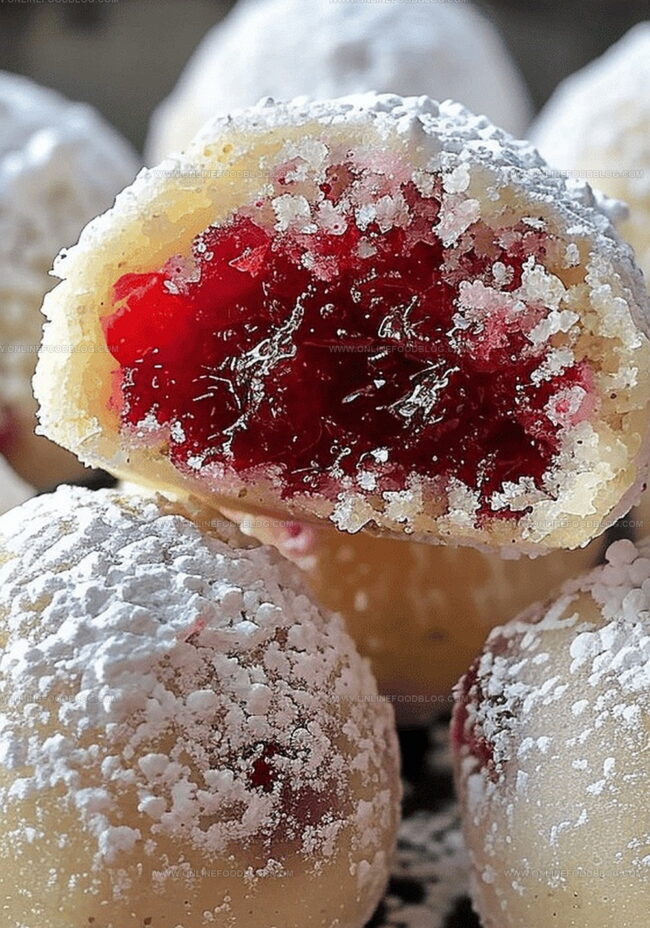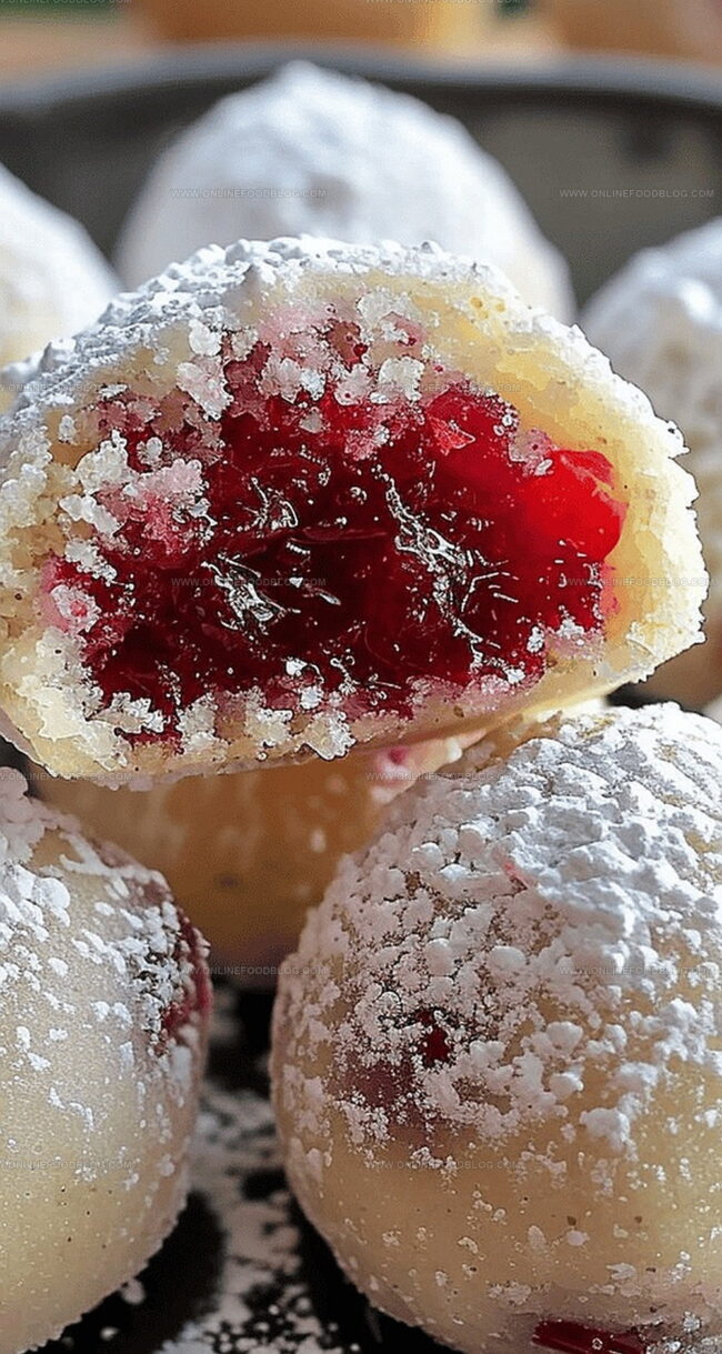 Scoop of dough. Gently flatten in palm. Place small dollop of cranberry preserves in center. Carefully fold dough around filling to create a ball.