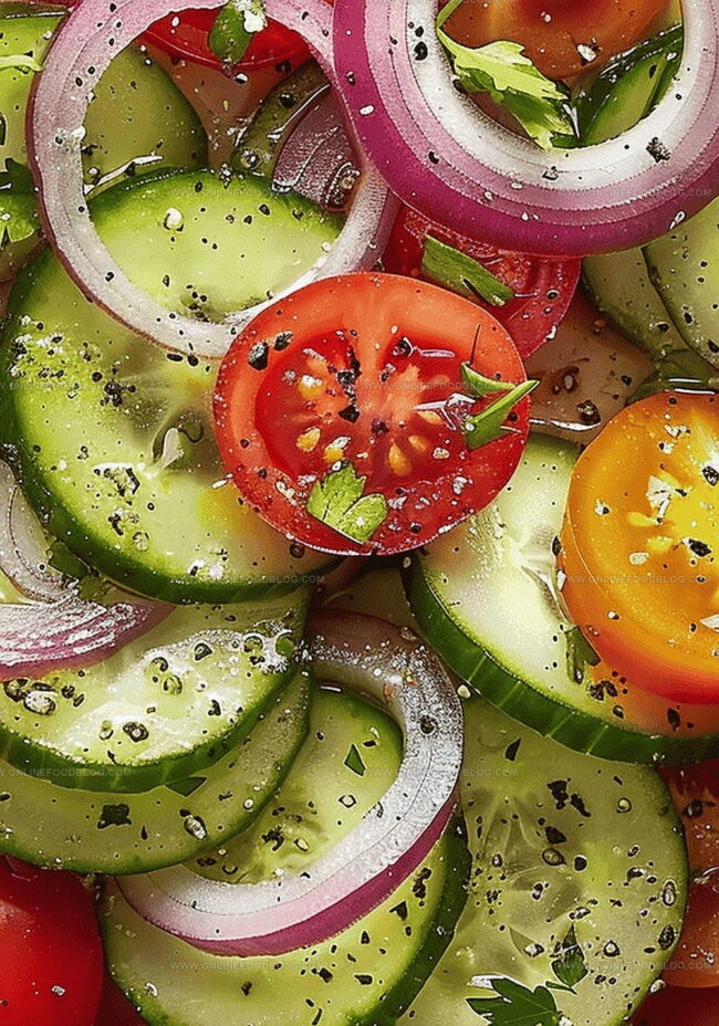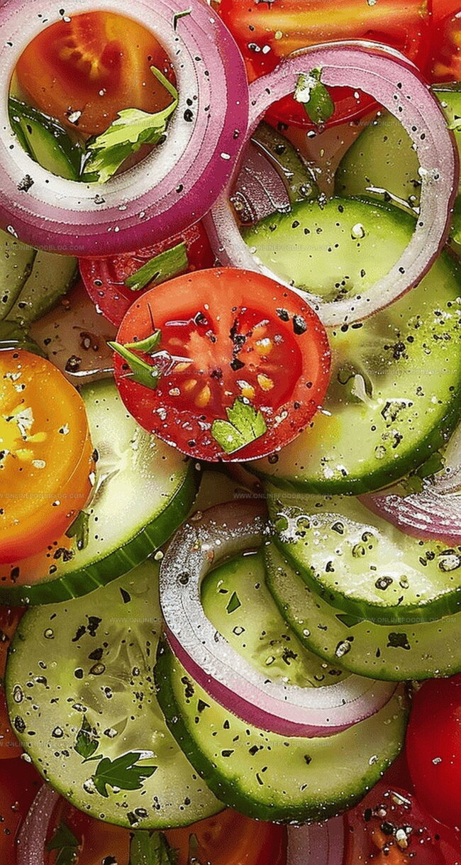 This crisp cucumber, tomato, and onion delight combines garden-fresh ingredients with zesty Mediterranean flavors.