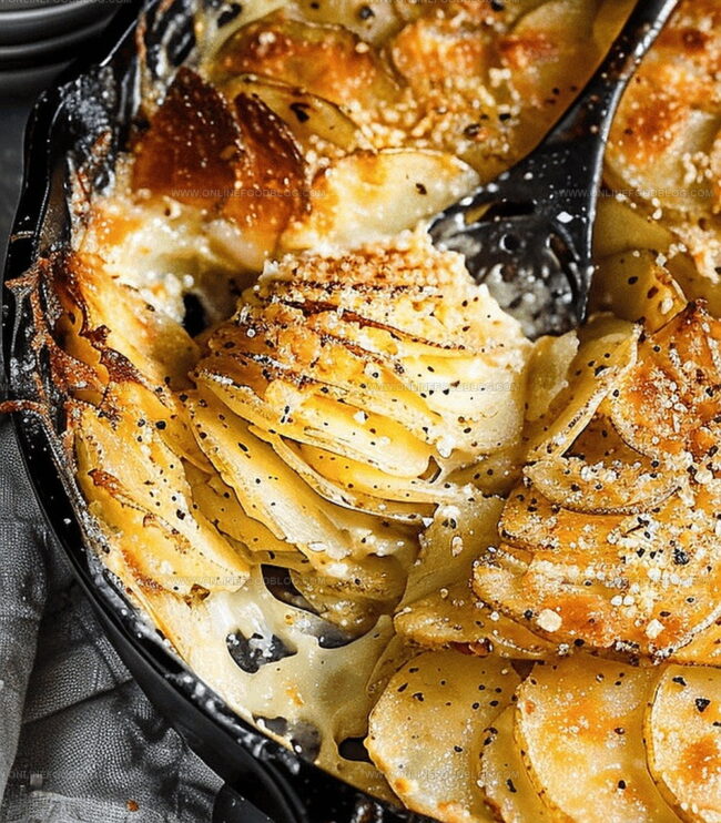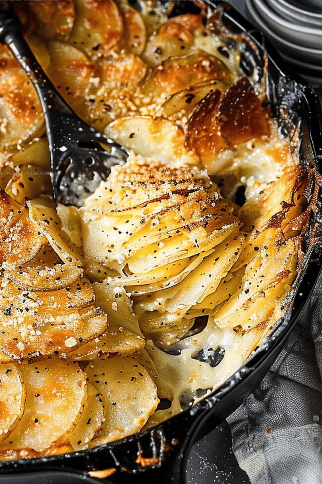 Layers of thinly sliced potatoes meld seamlessly with robust cheeses, creating a golden-brown masterpiece with irresistible textures.