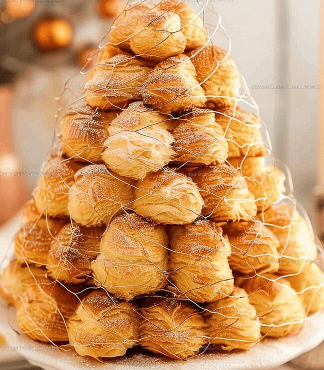 Delicate choux pastry spheres create an intricate structural marvel, each golden puff carefully assembled into a conical masterpiece.