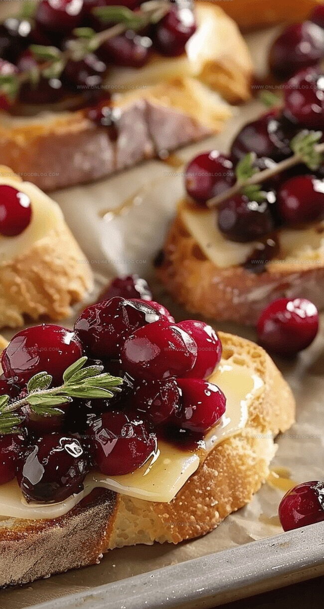 - Finish by generously topping each warm, cheesy crostini with the roasted balsamic cranberries, and garnish with a delicate sprig of fresh thyme for an elegant and aromatic touch.