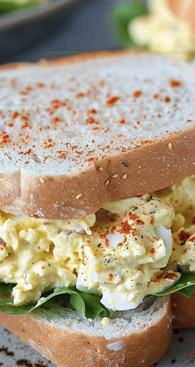 Cut sandwich diagonally. Plate immediately and savor the creamy, zesty egg salad delight. Perfect for lunch or a quick, satisfying meal.