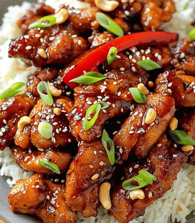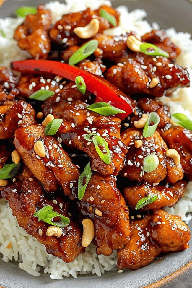 - Reintroduce cooked chicken and toasted cashews to the skillet, stirring to coat with sauce. Sprinkle with sesame seeds and chopped green onions. Serve immediately while hot.