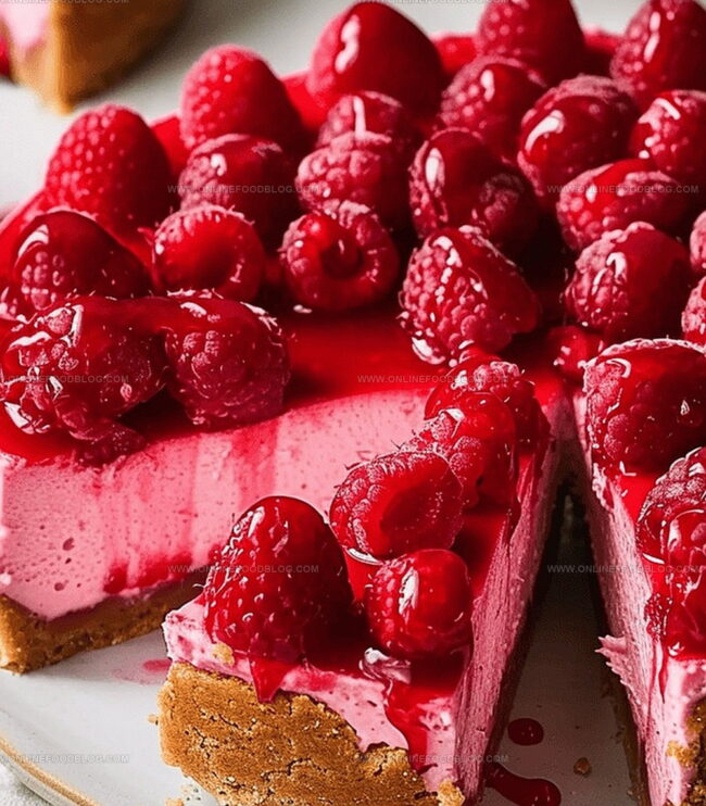 - Before serving, drizzle the raspberry sauce over the chilled cheesecake and garnish with extra fresh raspberries.