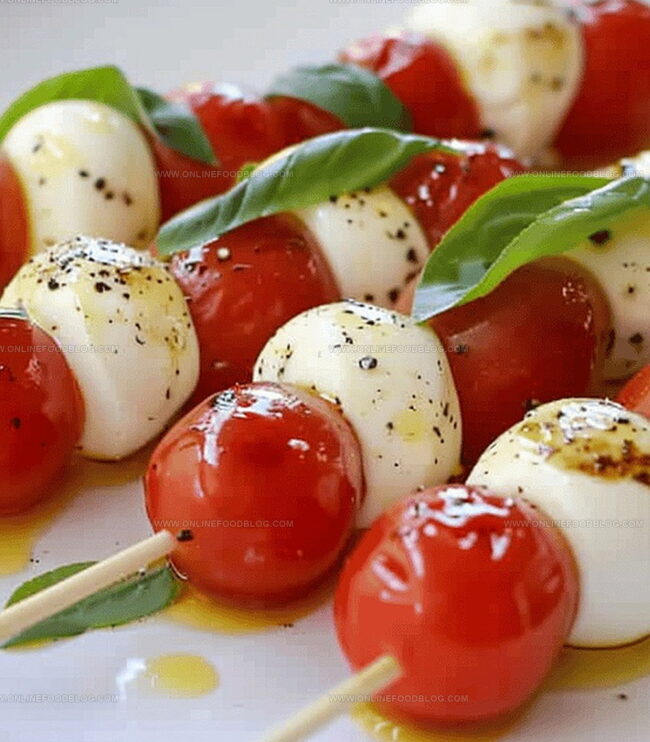 - Preparation: Assemble skewers by threading ingredients in a rhythmic, alternating sequence – starting with cherry tomato, followed by basil leaf, then mozzarella pearl, repeating until ingredients are fully utilized.