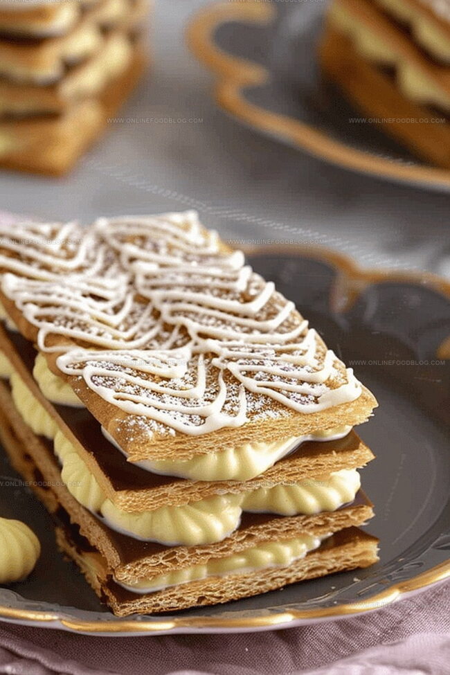 - Assemble the mille-feuille by alternating layers of baked pastry rectangles, pastry cream mixture, and decorative glaze.