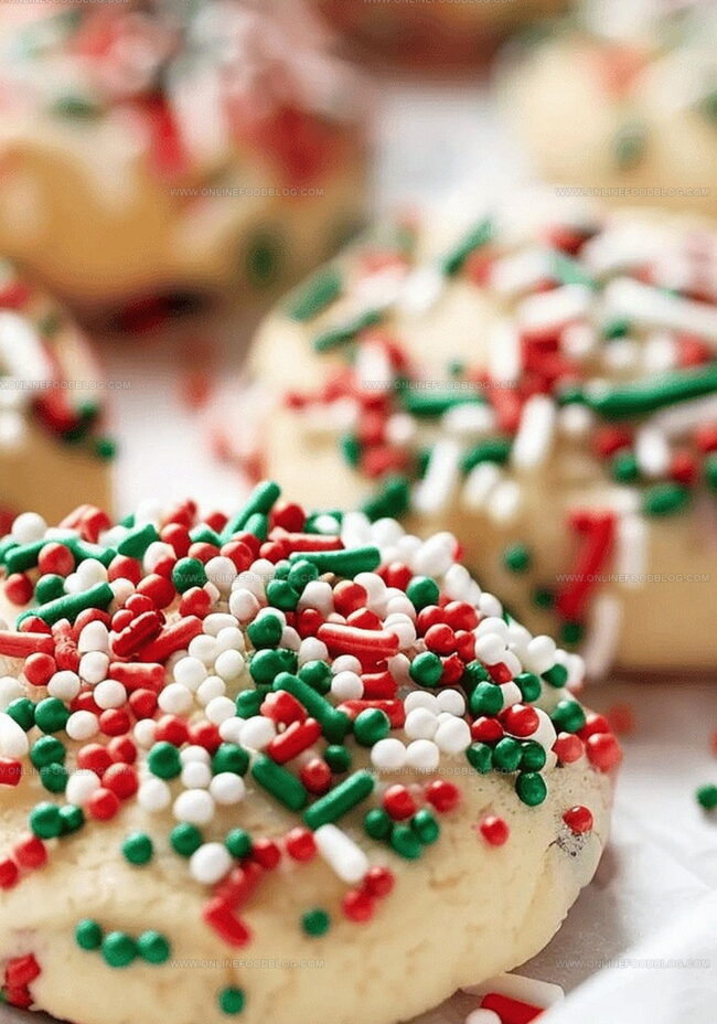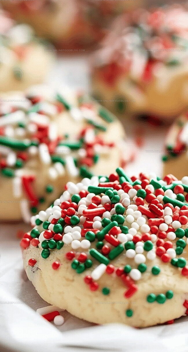 - Roll each dough ball generously in festive Christmas sprinkles, ensuring complete and even coverage.