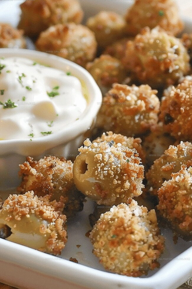 Perfect Party Pleaser: Bite-sized, golden-brown olives served with creamy garlic aioli create an irresistible finger food that will instantly elevate any gathering or casual get-together.