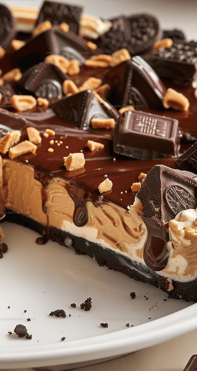 - Before the chocolate sets, garnish the pie’s surface with chopped Reese’s cups, creating an appealing, textured topping.