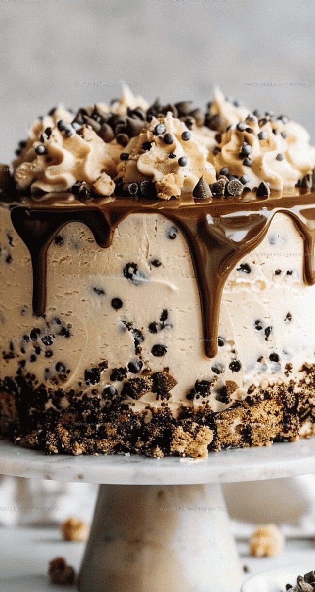 Drizzle luxurious chocolate ganache across the cake’s surface, allowing it to cascade elegantly down the sides. Sprinkle remaining cookie dough crumbles on top for a show-stopping presentation.