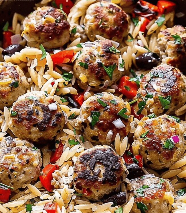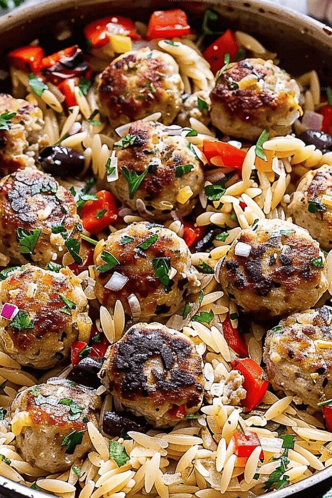 - Nestle browned meatballs atop orzo mixture, generously sprinkle crumbled feta cheese, and garnish with additional fresh herbs.