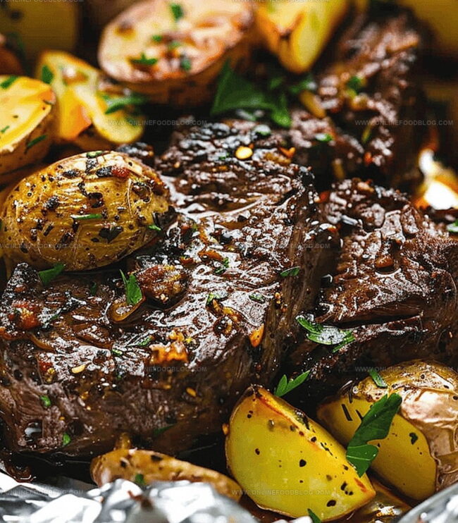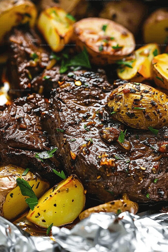 Divide the seasoned steak and potato mixture evenly between 4 sheets of 12×12 inch aluminum foil. Carefully wrap the foil tightly, creating sealed packets that will lock in all the delicious flavors.