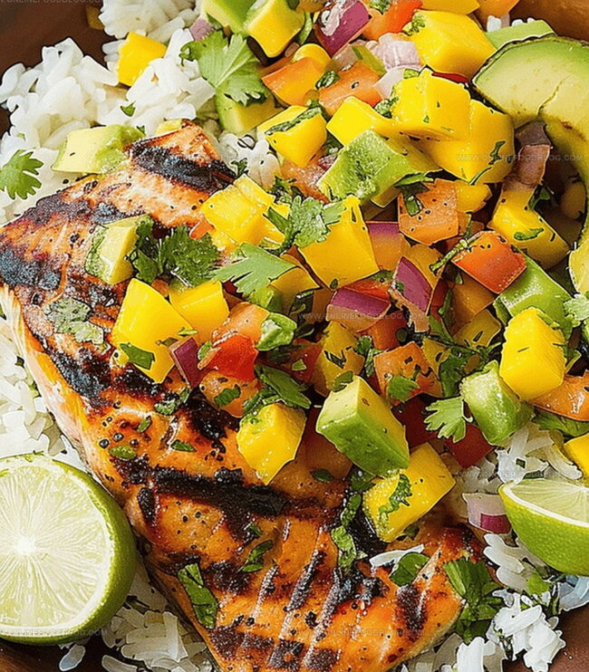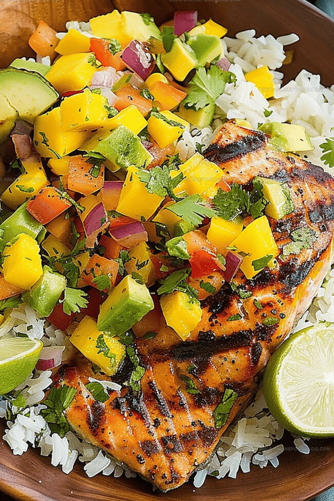 - Plate the grilled salmon atop a bed of fragrant coconut rice, generously garnishing with the vibrant avocado-mango salsa.