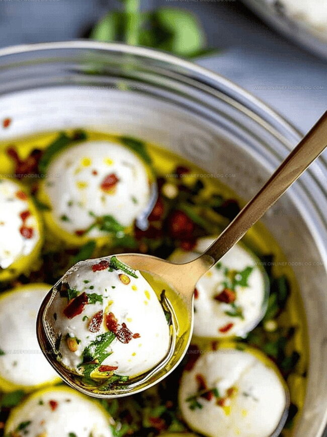Homemade olive oil marinated mozzarella balls showcase Mediterranean flavors with fresh herbs and garlic. Delicate cheese absorbs rich olive oil and aromatic spices, creating a simple yet elegant appetizer you can enjoy with crusty bread.