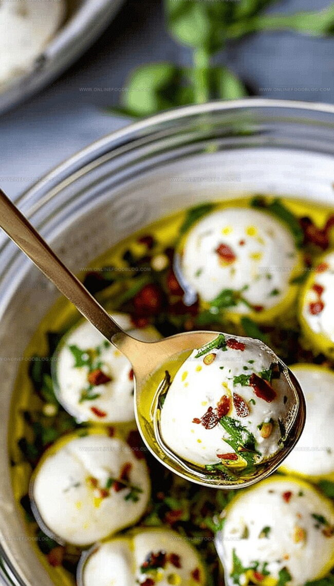 - Cheese Immersion: Gently submerge whole mozzarella balls into the prepared marinade, thoroughly coating each sphere to ensure maximum flavor penetration and uniform seasoning.