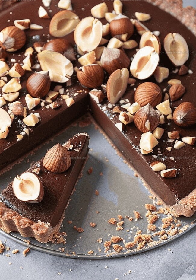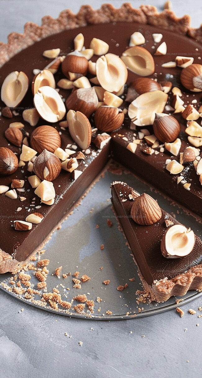 - Finish and Garnish: Remove tart from tin, sprinkle with toasted hazelnuts, and serve chilled for a decadent dessert experience.