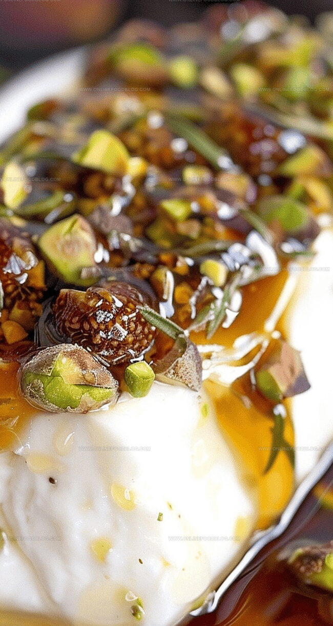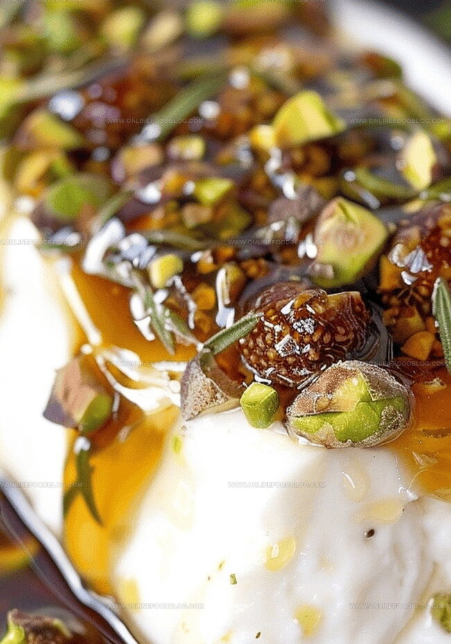 - Dress and Adorn: Gently warm honey and fig spread, then artfully drizzle and pour over the cheese, creating an elegant marbled pattern of golden and deep purple tones.
