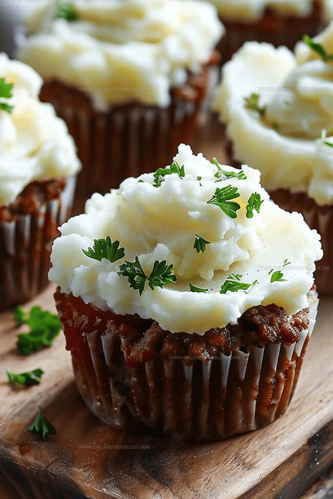 Pipe the mashed potatoes on top of each meat cupcake to create a frosting-like appearance. Sprinkle chopped fresh parsley over the top.