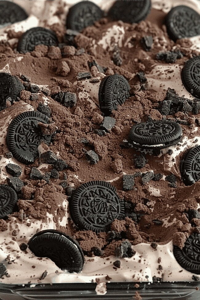- Sprinkle the second sleeve of crushed Oreo cookies over the top, ensuring complete coverage for maximum crunch and visual appeal.