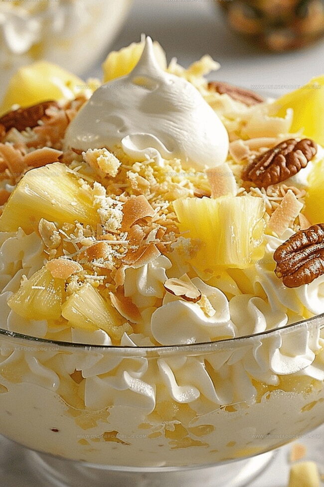 - Prior to serving, enhance the presentation by sprinkling additional chopped pecans, mini marshmallows, and shredded coconut across the surface, and optionally drizzle with extra crushed pineapple for an intensified tropical essence.