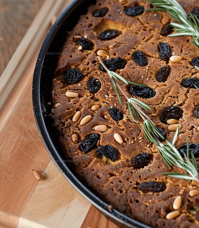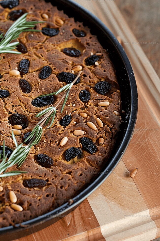Scatter a constellation of pine nuts, plump raisins, and fragrant rosemary sprigs across the batter, creating a rustic, earthy design.