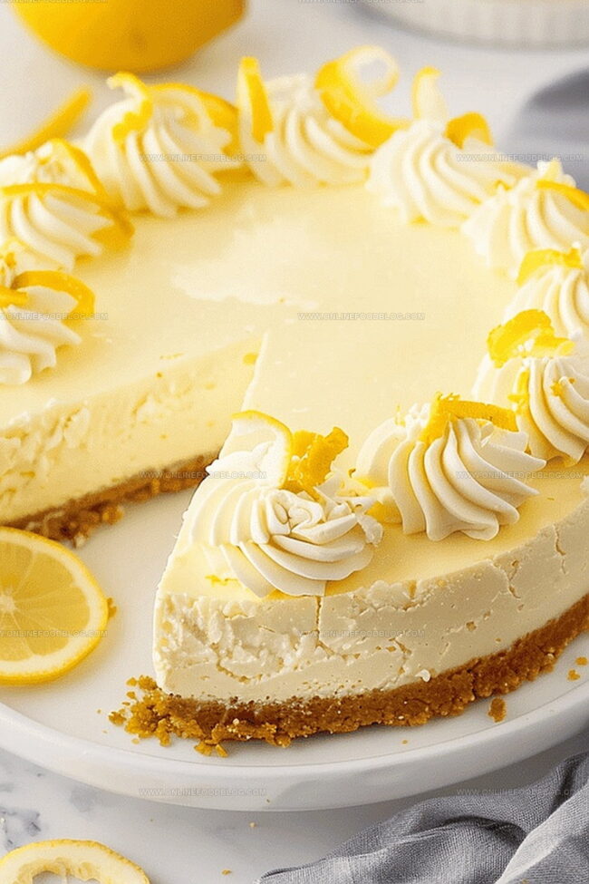 Present the chilled cheesecake, optionally topped with a dollop of soft whipped cream, ready to impress and satisfy sweet cravings with its refreshing lemony essence.