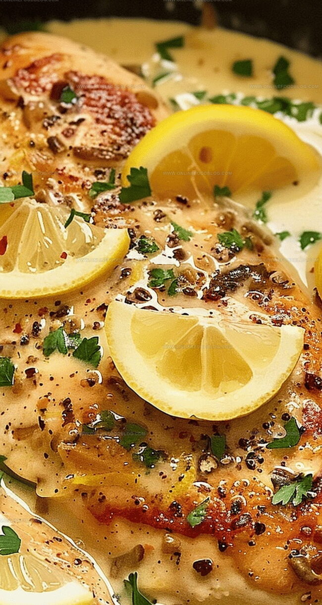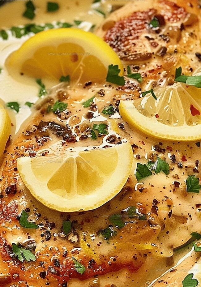Return chicken to the skillet, letting it gently cook in the creamy sauce. Add fresh lemon juice for brightness. Finish by garnishing with chopped parsley and delicate lemon slices. Serve immediately while sauce is warm and silky.