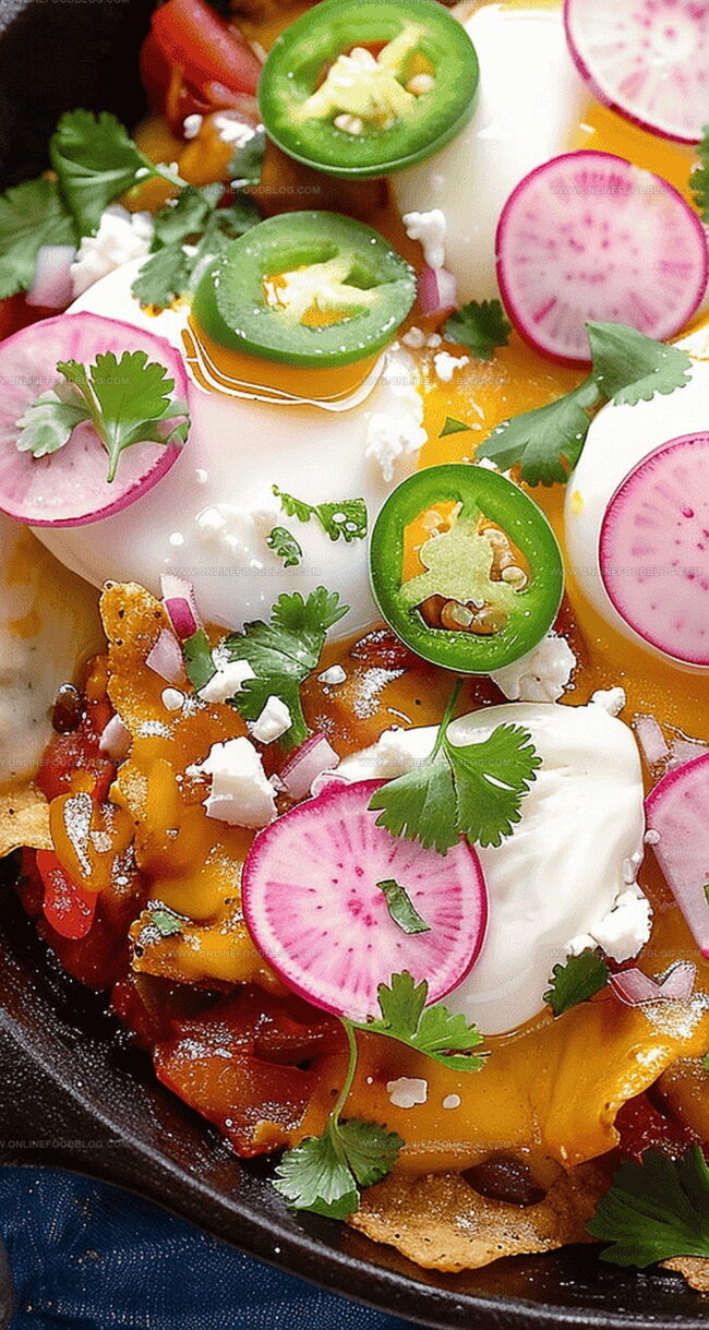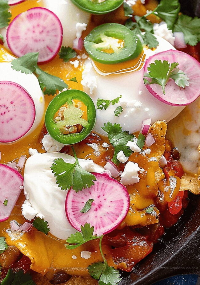 - Final Presentation: Remove nachos from oven, crown with freshly scrambled eggs, then embellish with sliced jalapeños, radish slivers, chopped cilantro, and a generous dollop of sour cream.