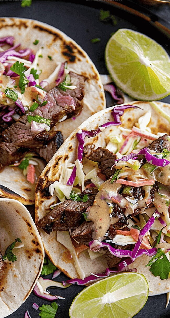 Taco Assembly: Layer seared steak strips onto warmed tortillas, generously top with chipotle lime coleslaw. Garnish with fresh cilantro and optional pickled jalapeños for enhanced flavor and visual appeal.