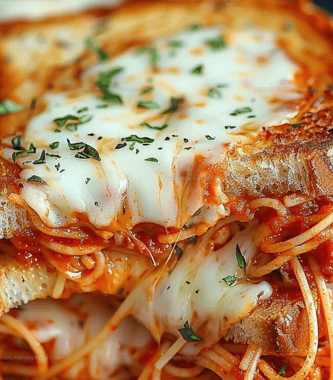 Spaghetti Grilled Cheese Sandwich merges classic Italian pasta with American comfort food. Melted cheese and twirled spaghetti nestle between crispy, buttery bread, creating a cross-cultural culinary adventure that satisfies cravings and sparks joy.